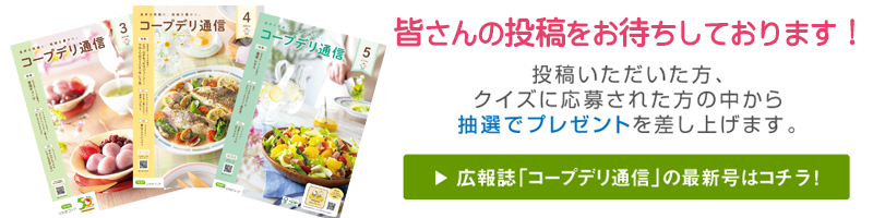 テーマトーク、身の回りの話題やくらしの知恵、お気に入りのコープの商品、簡単レシピ、誌面の感想など、皆さんの楽しいお便りをお寄せください。